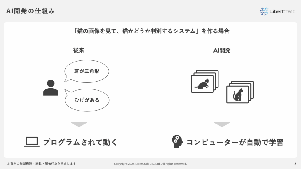 AI開発とは、人間が行っている「判断」や「学習」「予測」といった知的な作業を、コンピューターにできるようにする仕組みを作ることを指します。