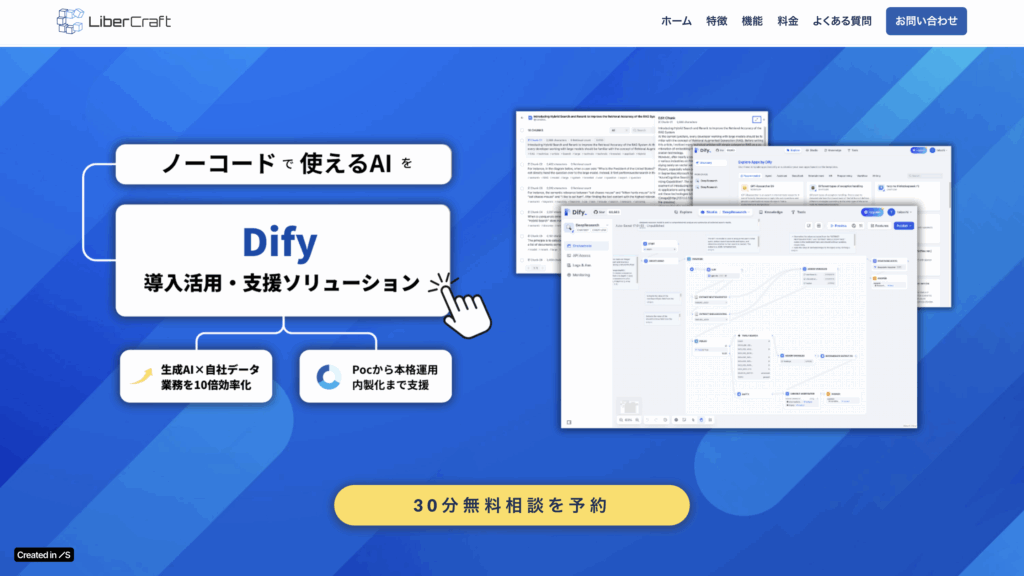 また、弊社リベルクラフトではDifyの導入・活用を一気通貫で支援しています。ビジネスの成果に直結し、自社の業務効率化や売上向上など期待できます。