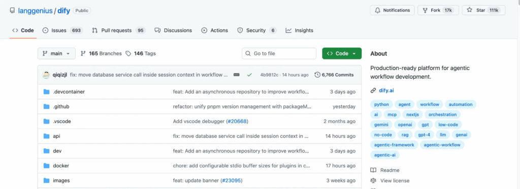 DifyはオープンソースソフトウェアとしてGitHubで公開されており、企業は自社のセキュリティポリシーに合わせてオンプレミス環境での運用とクラウド版での運用を選択できる柔軟性を持っています。