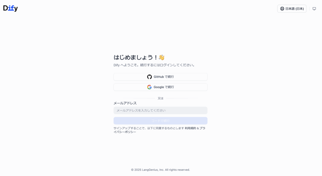 まずはDifyの公式サイトにアクセスし、ログインを行っていきます。