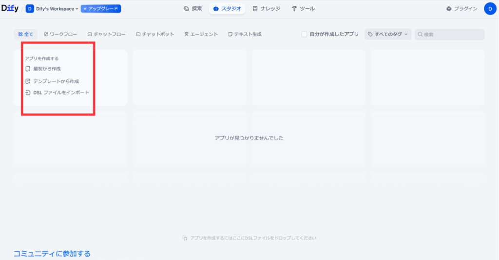先ほど解説したDifyのアカウントにログイン方法を実行し、作成方法を選択します。今回はオリジナルのチャットボットを作成するため、「最初から作成」を選択します。