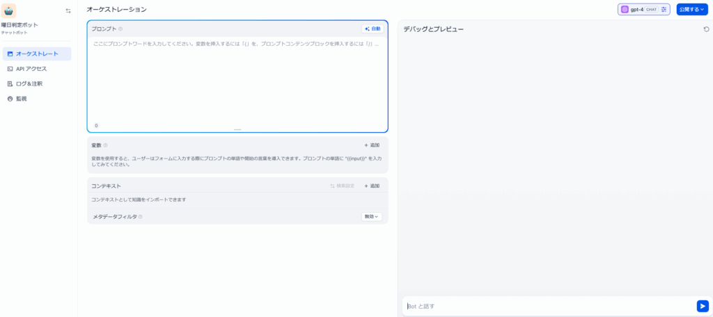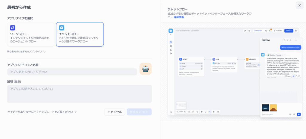 例えば、顧客問い合わせ対応ボットを作る場合、システムプロンプト欄にAIの役割を記述し、ワークフロー上で「ユーザー入力から AI回答」という流れをブロックで繋げるだけで、わずか数十分で実用的なプロトタイプが完成します。