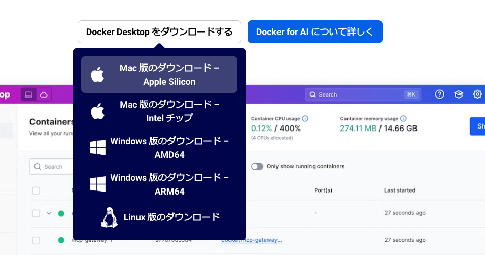 まずはDockerの公式サイトにアクセスし、ダウンロードを実施していきます。ダウンロードする前にOSを選択する必要があるため、自身のパソコンに当てはまるものを選択してください。