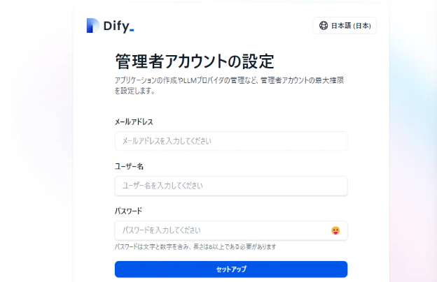 コマンドプロンプト上で処理が完了すれば、ブラウザでDifyのログイン画面が表示されます。