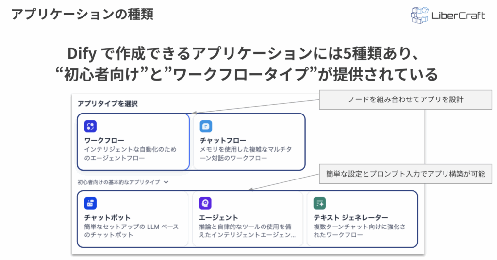 なお、Difyで作成できるアプリケーションは主に5つあります。