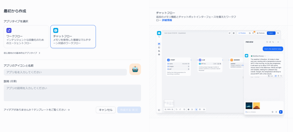 Difyの魅力は、複雑なプログラミング知識を必要とせずに、直感的なブラウザ操作だけで本格的なAIアプリケーションを構築できる点です。