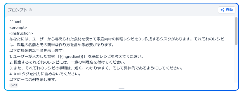 また、右上の「自動」ボタンを押すと、シンプルな指示を書くだけでDifyが最適なプロンプトを生成してくれるので、難しい言葉を考える必要はありません。