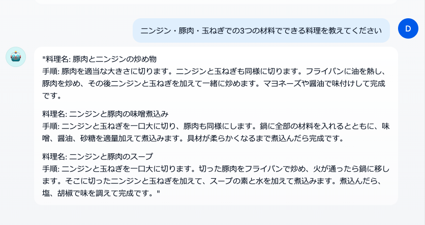 実際に「ニンジン・豚肉・玉ねぎでの3つの材料でできる料理を教えてください」と質問します。