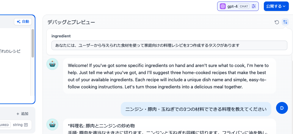 プロンプトを設定したら、画面右側の「デバッグとプレビュー」で実際にボットを動かしてみましょう。ここではユーザーとして入力し、チャットボットが正しく答えるかを確認できます。