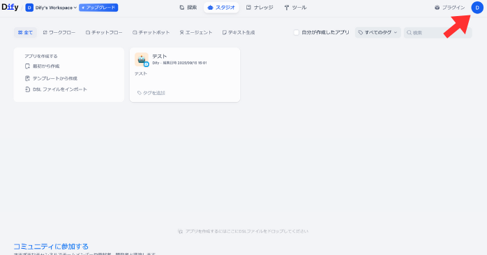 Difyの開発画面から画面右上にあるアカウントのアイコンをクリックします。