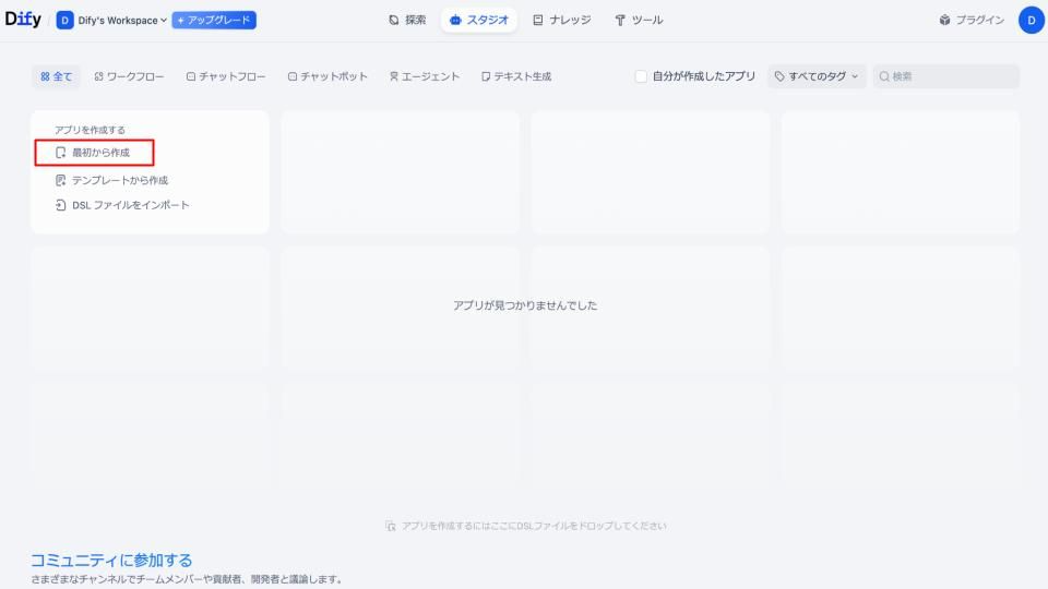 まずはアプリの作成を行なっていきます。下記はDifyログイン後の初期画面で、画面右上にある「最初から作成」を選択しましょう。