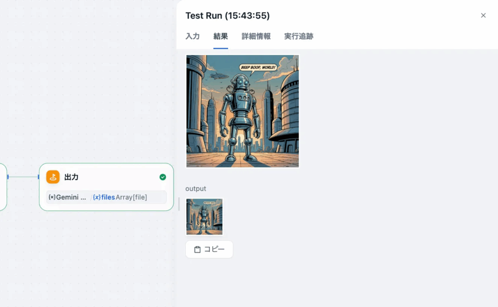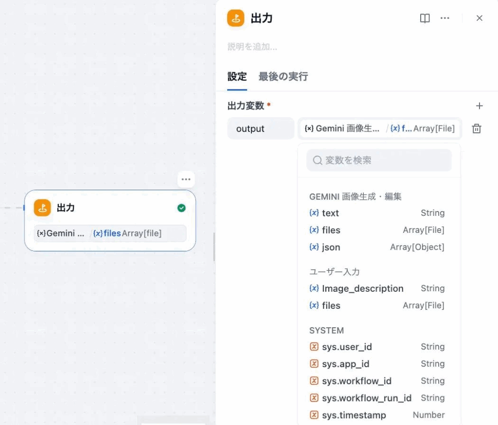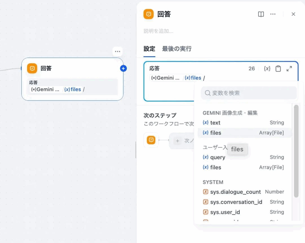 という仕組みです。特に {{Gemini.files}} を書くだけで画像として表示される点が、Difyの便利なところです。