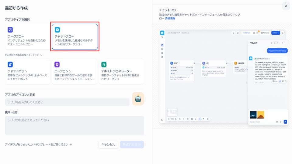 最初から作成をクリックすると、以下の画面に遷移します。ここでは、チャットフローを選択し、画像生成AIアプリの名前を入力しましょう。