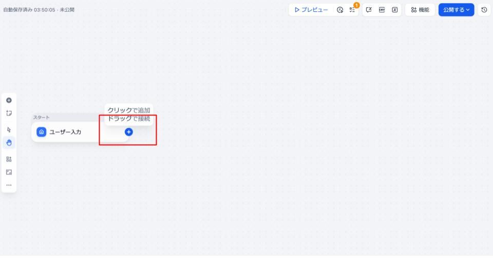 次にワークフローを構築していきます。ワークフローとは、ノード(処理単位)をドラッグ&ドロップでつなげて、アプリを構築していく作業場所のようなものです。