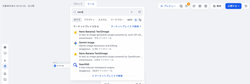 開始ノードの右にある「+」を押し、ツール一覧から「Nano Banana」を追加します。ここは先ほどの画像生成AIの作り方と同じになるため、省略します。