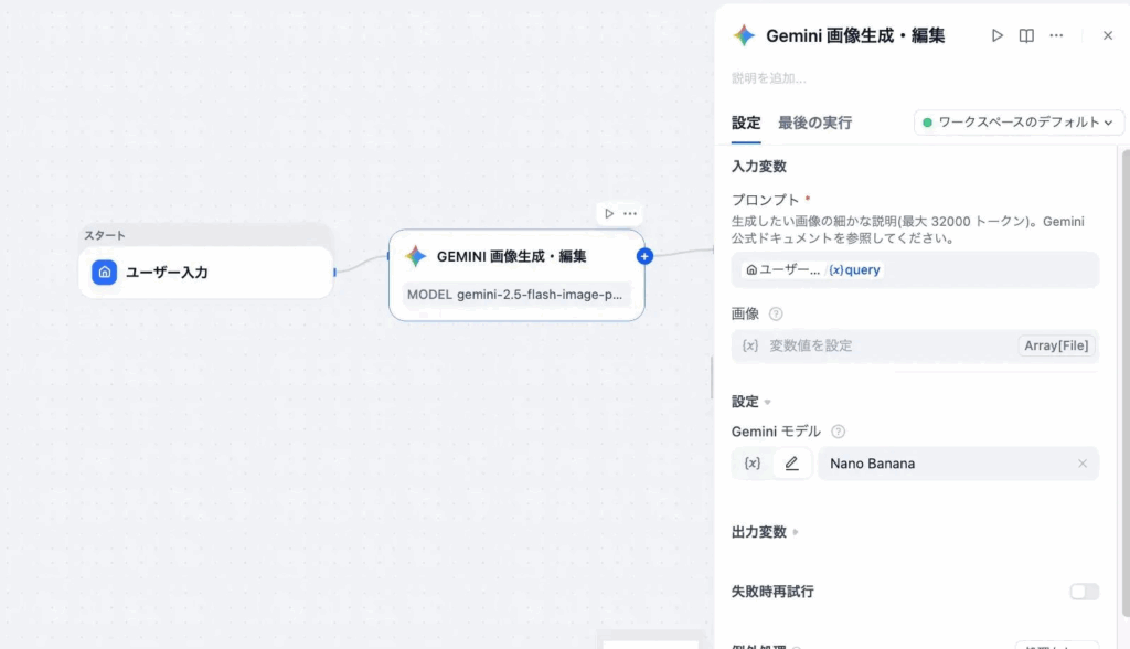 ここでは、ユーザーが入力した文章(sys.query)をそのままNano Bananaに渡す設定を行います。