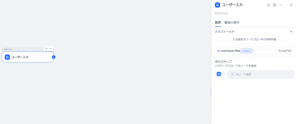 Difyで新しいワークフローを開くと、最初から「開始」ノードが置かれています。このノードに変数を追加して、ユーザーが入力できる欄を作ります。