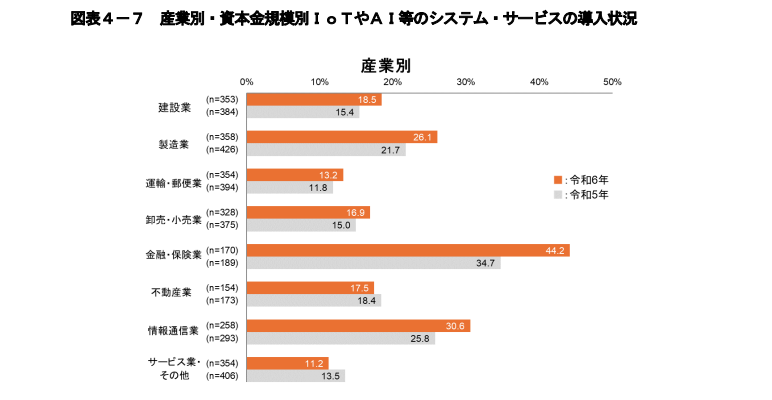 数値だけに注目すると、約5社に1社という割合です。産業別に見ると、平均より導入状況は高いものの、まだまだ生成AIを導入する企業は少ないと言えるでしょう。