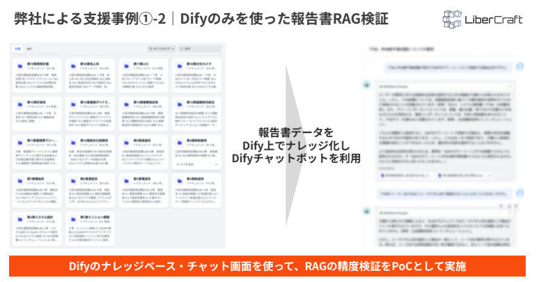 生成AIを活用すると、機械学習モデルが算出した予測結果を基に、その背景にある要因や傾向を整理。実際に弊社リベルクラフトでは、Difyを用いて蓄積される報告書データをナレッジ化し、RAGによって高精度に要約・抽出するPoCを実施してきました。
