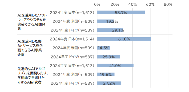 実際にIPAが公表したデータでは、日本でAIを活用した人材は世界的にみてもかなり不足していることがわかります。