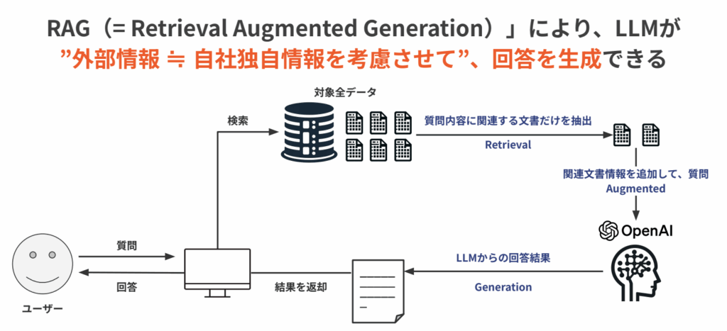 この3つのステップがうまく連携することで、ChatGPTのような一般的なAIでは答えにくい自社独自の質問に対しても、より正確な回答ができるようになります。