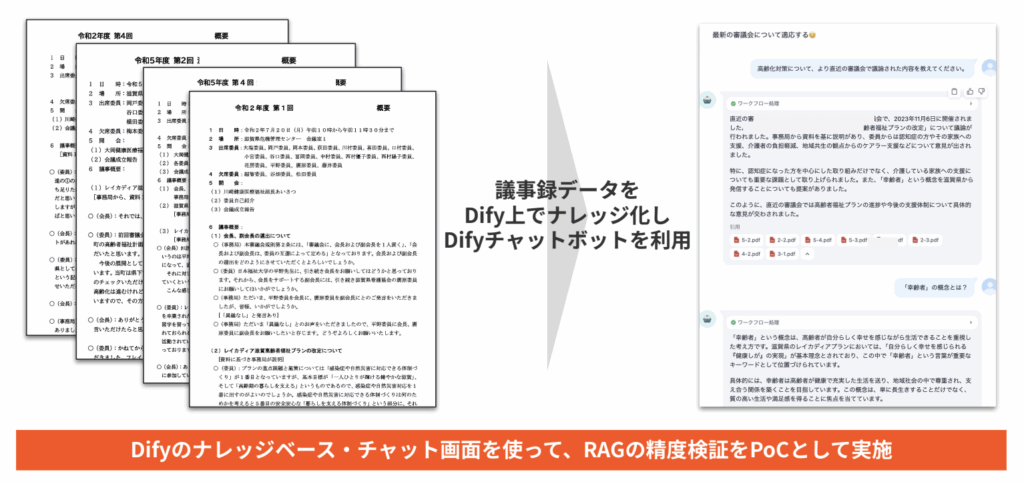 そこでリベルクラフトは、DifyのRAG機能を使い、議事録をまとめて検索できる仕組みづくりを行いました。