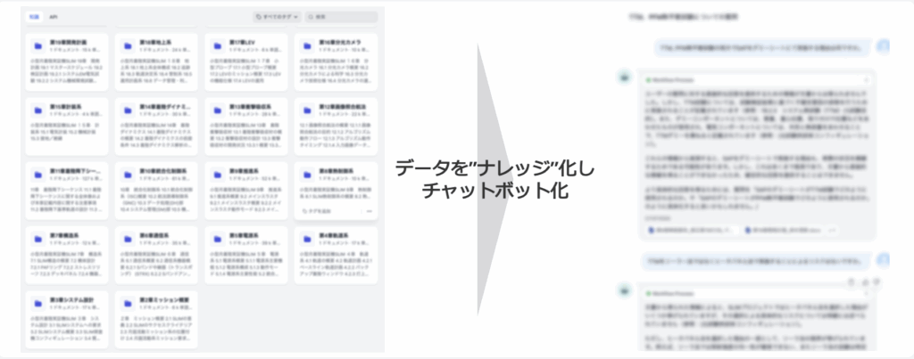 アプリケーション構築も、RAGの活用例の1つとして挙げられます。 リベルクラフトが支援した事例でも、社内に蓄積された資料や文書をRAGで横断的に検索できるようにし、必要な情報を対話形式で引き出せるアプリケーションとして活用されています。