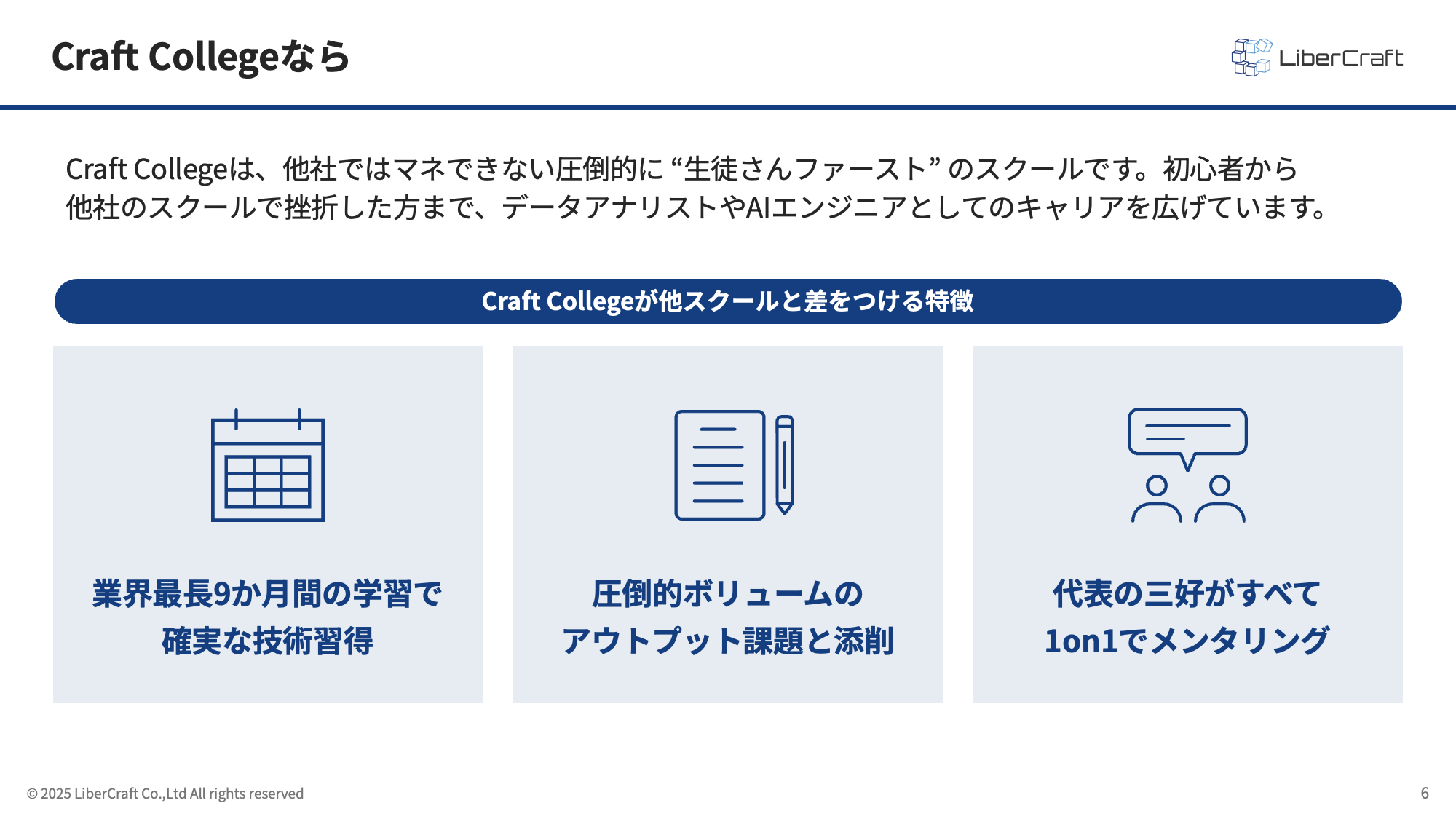 リベルクラフトのCraft Collegeご紹介 本資料を通してわかること Craft Collegeのご紹介 データ分析人材の需要の高まり Craft Collegeならではの特徴 実際に受けた受講者の声 フォームの送信完了後に メールにて資料を確認できます。