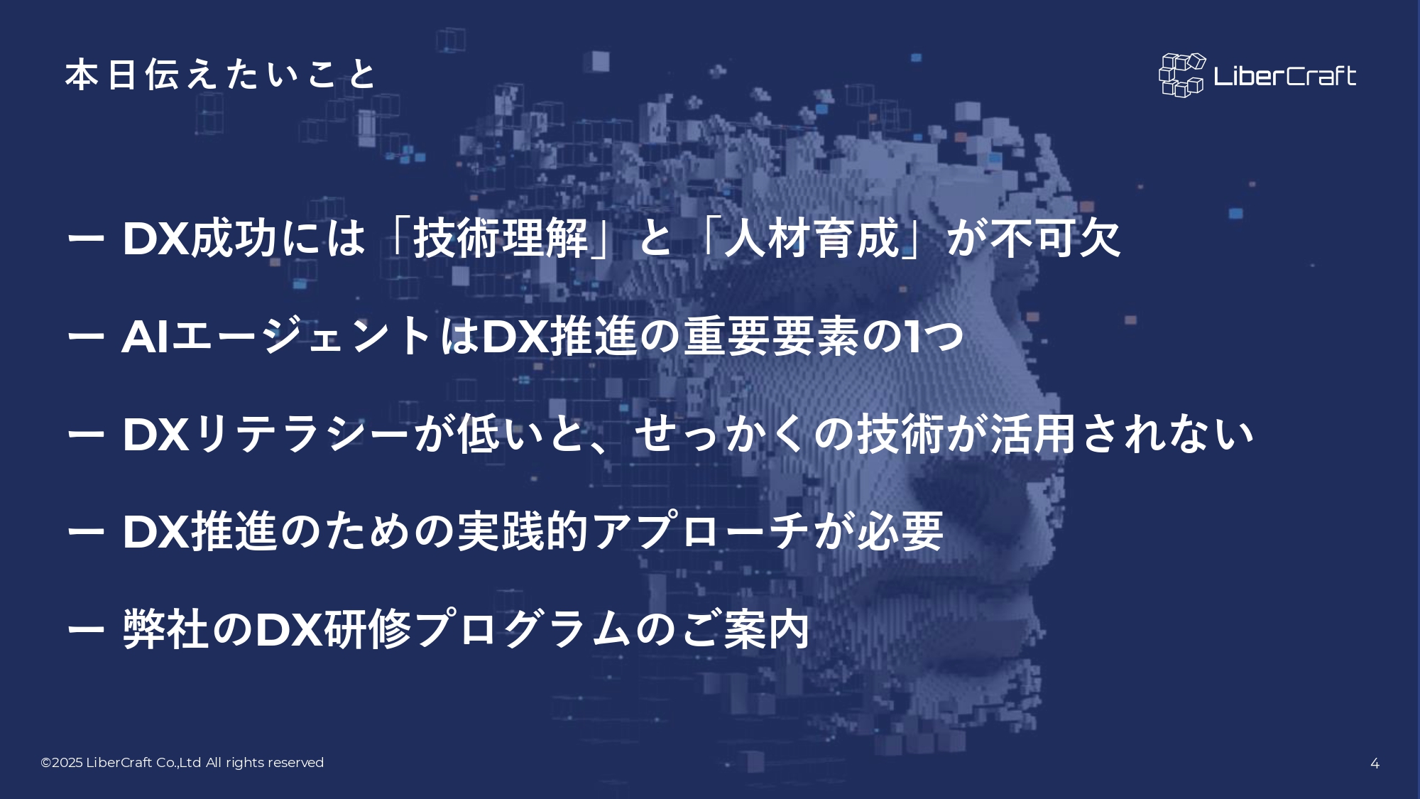 AI時代のDX推進リテラシーが企業競争力を決める! 本資料を通してわかること AIエージェントの概要とDXへの期待 生成AIからデータ分析を実現する方法 企業のツール導入における落とし穴 DXリテラシー向上の重要性と弊社研修が提供する価値 研修導入のメリットと成功事例 フォームの送信完了後に メールにて資料を確認できます。